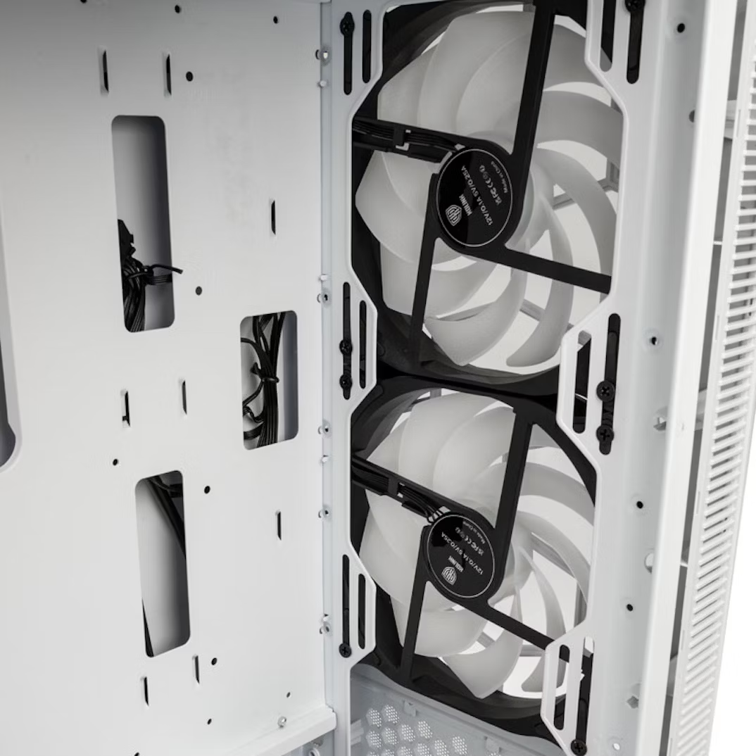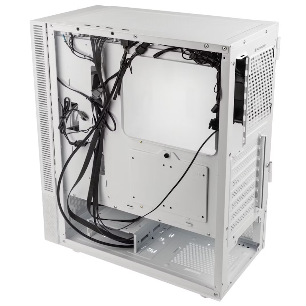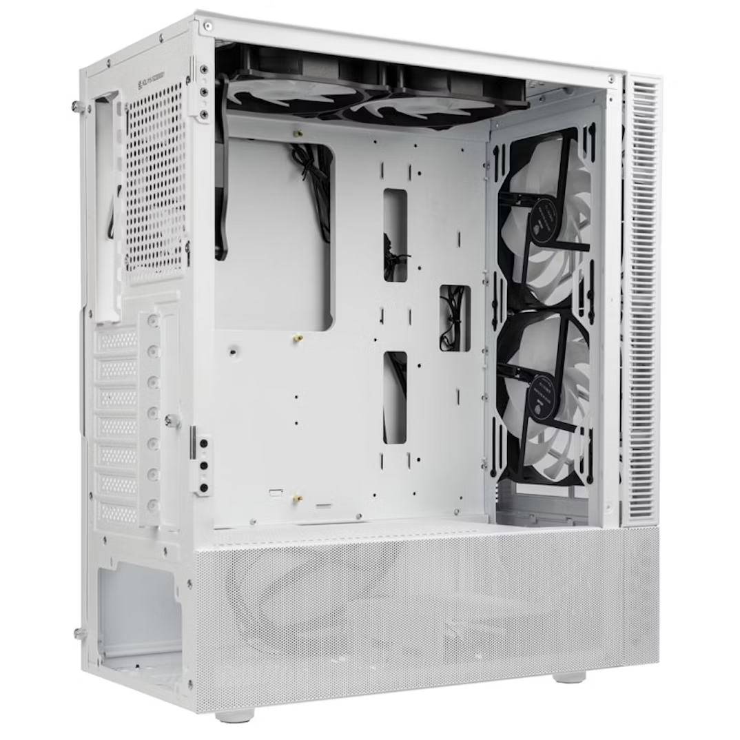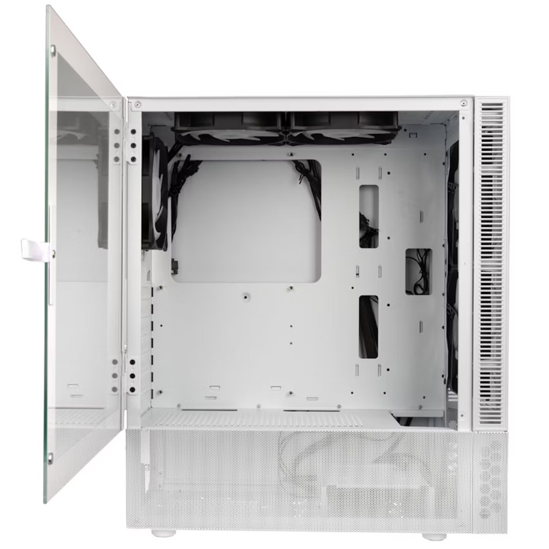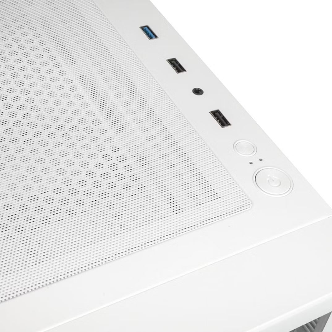 This is the Glass model in white. The front panel is manufactured from tempered glass, with subtle mesh side ventilation. To ensure this chassis has ample airflow, the dedicated PSU shroud is formed with mesh panelling. As the white model, the exterior, interior, and shroud are all white, with a two-tone material finish for a bold effect.